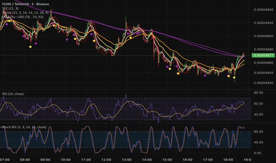 shows ema divergence above 200 ema. When the 7 ema diverges from 21 and 50 really fast, the channel shows up