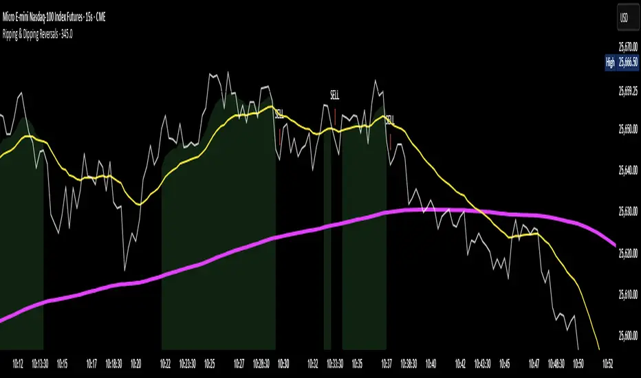 Uses a ribbon of emas from 987 to 8. When all emas align from highest to lowest in either direction we have "Ripping" or "Dipping." If ripping or dipping end AND there have been a set number of rip/dip ends since the last crossover of the 987, a trade is indicated.