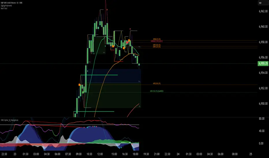 Red’s Tool is a comprehensive, price-action–focused TradingView indicator that combines institutional market structure analysis with momentum-based trend confirmation. It visualizes Order Blocks, Fair Value Gaps, Breaks of Structure, Rejection Blocks, pivot levels, high-volume bars, and OB+FVG confluence, helping traders identify areas of liquidity, imbalance, and potential reaction zones.