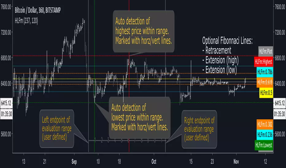 Auto detect highest/lowest price within a range of bars (user defined). The range slides forward in time as new bars appear in the chart.
