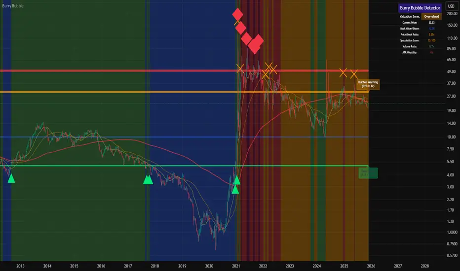 This indicator implements Michael Burry's bubble detection methodology, originally outlined in his famous 2020 analysis of GameStop (GME). Burry identified extreme bubble conditions when a stock's price significantly deviates from its fundamental book value, specifically when the Price-to-Book ratio exceeds extreme multiples.