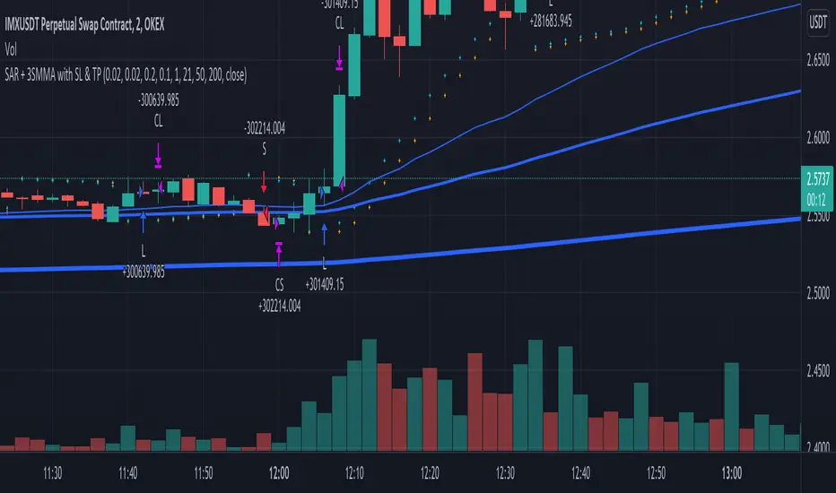 This script is a combination of SAR strategy and 3 Smoothed Moving Averages.