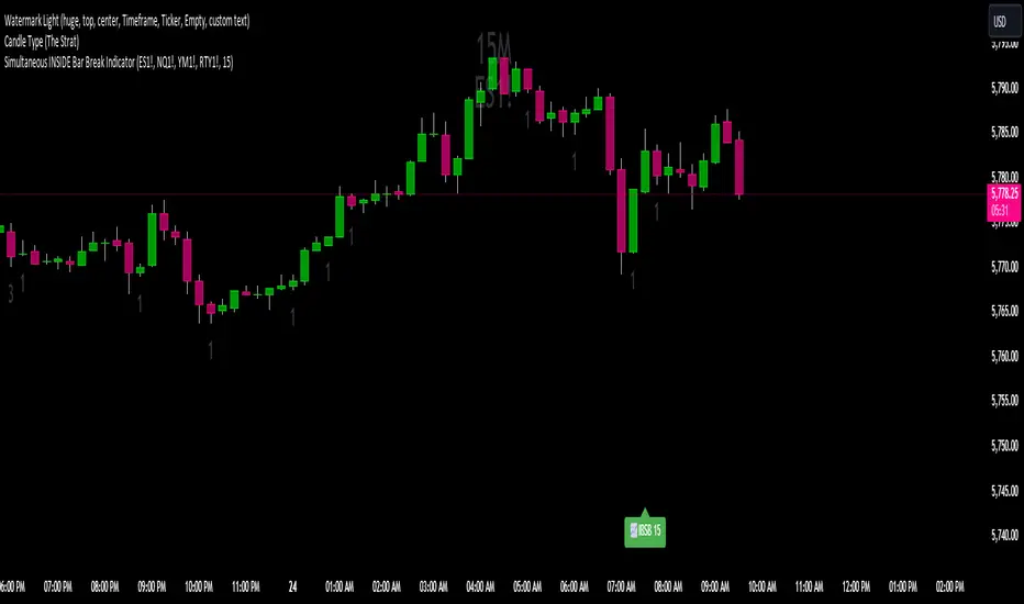 Label Display: When a simultaneous inside bar break occurs, a label is plotted on the chart—either green for a bullish break (below the candle) or red for a bearish break (above the candle). The label will display the timeframe you set in the settings (e.g., "IBSB 60" for a 60-minute break).
