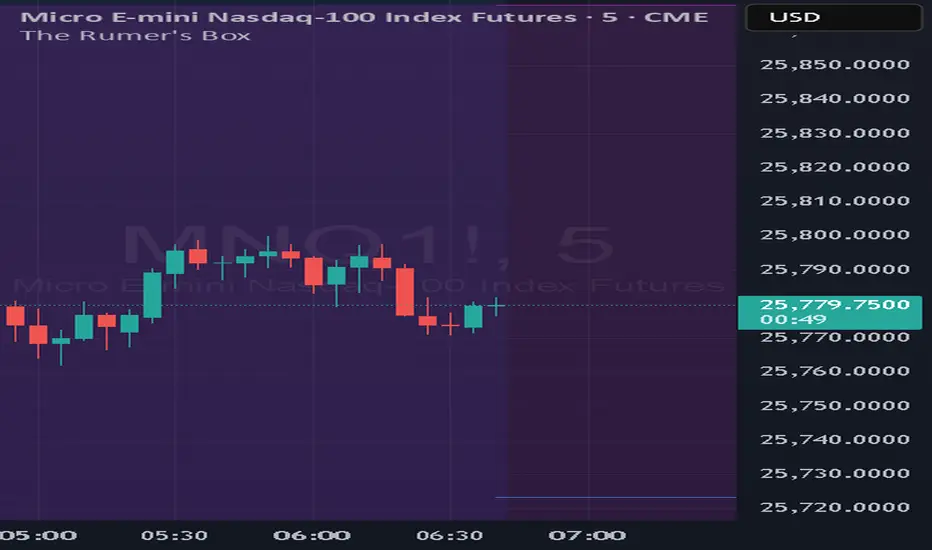 “The Rumer's Box Theory” is a visual trading indicator that allows traders to quickly identify the previous daily candle’s high and low across any timeframe. It displays a purple box spanning the previous day’s high to low, with a blue horizontal line marking the 50% midpoint for quick reference. The settings also provide options to extend the box and midpoint line to the left, giving traders flexibility in how the indicator appears on the chart.