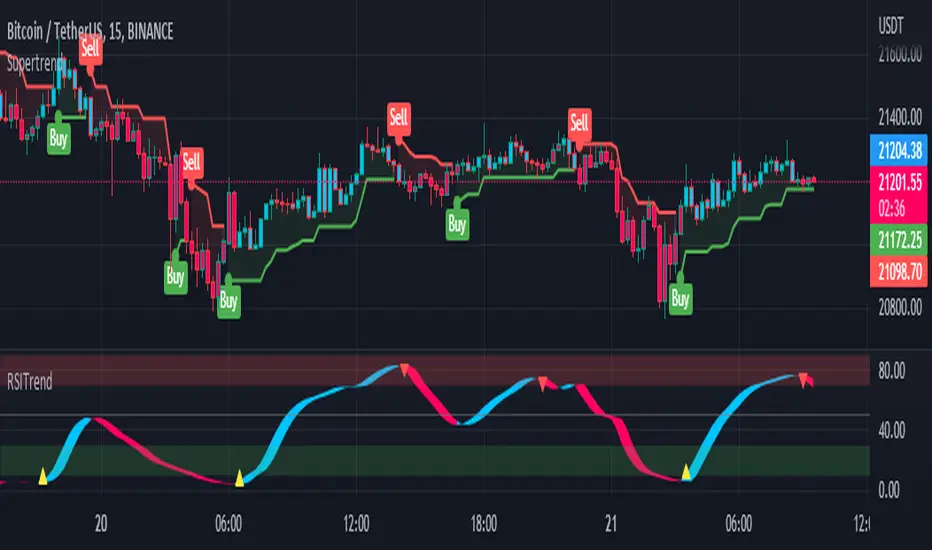 RSI Hull Trend is a hybrid indicator with RSI of HULL Signal. The Hull MA is combined with RSI to see if the Hull MA Buy/Sell Signal is in overbought or oversold condition. Buy Sell Signals are plotted based on settings of OB/OS or RSI. This indicator is very useful to see if the Trend is in Exhaustion or Beginning of a Trend. Entry and Exit conditions can be more precise based on OB/OS condition of price action. In addition normal RSI trend is plotted with trend color from Hull MA. Best Performance with Heiken Ashi Candles.