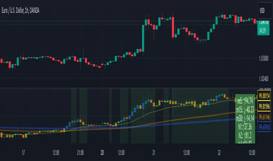 The TripleFlows Master EUR indicator is a technical analysis tool designed for TradingView to systematically evaluate the strength or weakness of the Euro (EUR) across 7 major currency pairs. This indicator provides a clear and objective measure of EUR momentum by analyzing moving averages, aggregating the data into a comprehensive Flow Index, and visualizing the collective price action of the Euro.