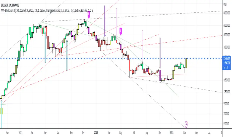 for example, breaking the primary trendlines are shown by color change of the candles and in the same time by a Break symbol as a label.