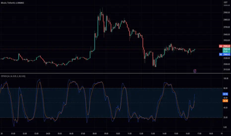 The Stochastic Oscillator is a momentum indicator used in technical analysis to determine potential overbought or oversold conditions in an asset's price. It compares the closing price of an asset to its price range over a specified period. However, the Stochastic Oscillator is susceptible to false signals due to its sensitivity to price movements. This is where our custom implementation comes in, offering a smoother signal without noticeable lag, thus reducing the number of false signals.