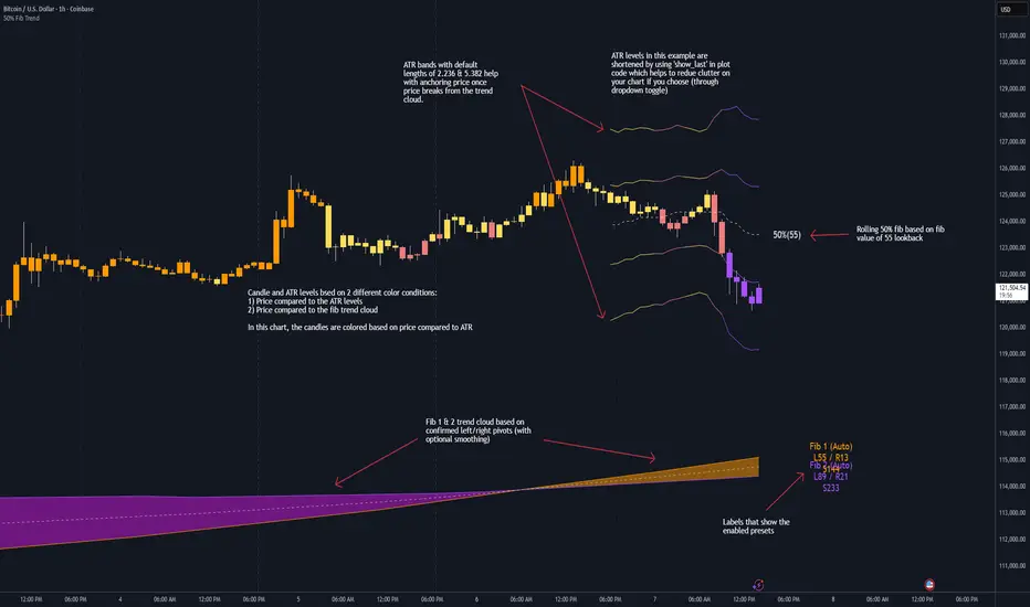 This indicator plots two structural 50% fibonacci midpoints from recent confirmed 'left/right' swings that form a *cloud* of equilibrium, then adds a rolling 50% fibonacci range midpoint based on a lookback window that's wrapped in ATR bands. Importantly, it solves a specific trading problem: