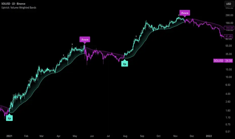 This indicator, Uptrick: Volume Weighted Bands, overlays dynamic, volume-informed trend channels directly on the chart. By fusing price and volume data through volume-weighted and exponential moving averages, the script forms a core trend line with adaptive bandwidth controlled by volatility. It is designed to help traders identify trend direction, breakout entries, and extended conditions that may warrant take-profits or pullback re-entries.