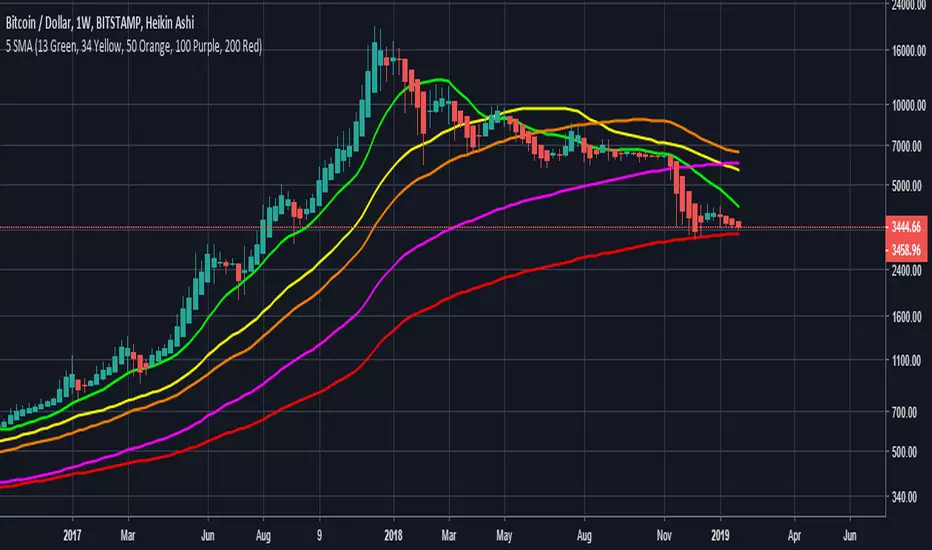 5 Simple Moving Averages (13 Green, 34 Yellow, 50 Orange, 100 Purple, 200 Red)