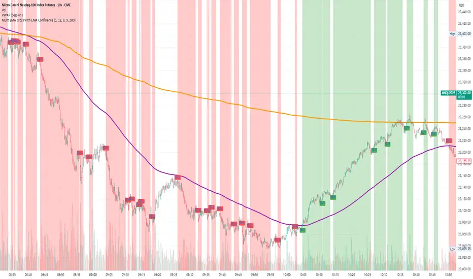 This indicator combines the power of multiple EMA crossovers with a higher-timeframe confluence filter to help traders visualize potential bullish and bearish conditions on their charts.