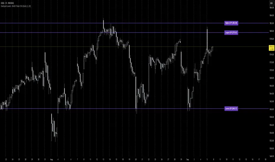 This script allows the user to input three darkpool levels (obtained from other sources) which are then plotted and labeled. The script uses CSV format for data entry as shown below; with this being the case, user can add as many tickers as desired and the indicator will display the levels as long as the user entered the ticker data into the input section of the indicator.