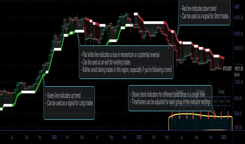 This script is an easy-to-use trend indicator, which is based on another popular indicator called "Supertrend". The basic idea is very simple, i.e. to compute Average True Range(ATR) and use that as the basis for trend detection. The key difference lies in a custom trend detection method, that computes trends across different timeframes and projects them in a table view. The script also tries to improve the behaviour of the existing indicator by highlighting flat regions on the chart, indicating sideways market or potential trend reversals.
