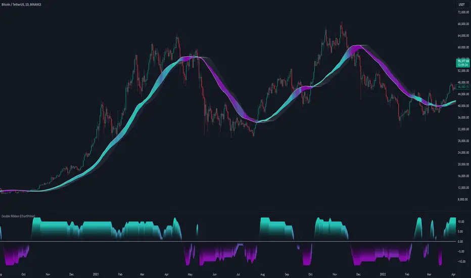 The Double Ribbon - ChartPrime indicator is a powerful tool that combines two sets of Simple Moving Averages (SMAs) into a visually intuitive ribbon, which helps traders assess market trends and momentum. This indicator features two distinct ribbons: one with a fixed length but changing offset (displayed in gray) and another with varying lengths (displayed in colors). The relationship between these ribbons forms the basis of a trend score, which is visualized as an oscillator. This comprehensive approach provides traders with a clear view of market direction and strength.