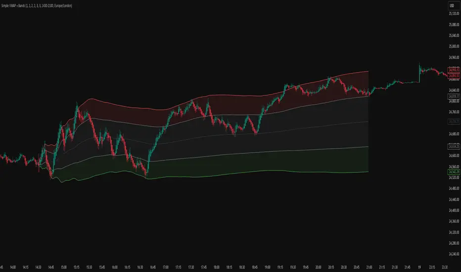 A clean and customizable VWAP (Volume Weighted Average Price) indicator with standard deviation bands and RTH (Regular Trading Hours) session support.