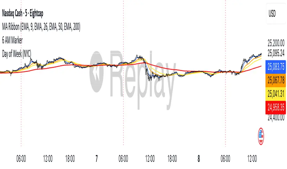The Day of Week (NYC) indicator displays the weekday name (Monday, Tuesday, Wednesday, etc.) at the bottom of a separate panel, synchronized with midnight New York time (00:00) for each trading day.