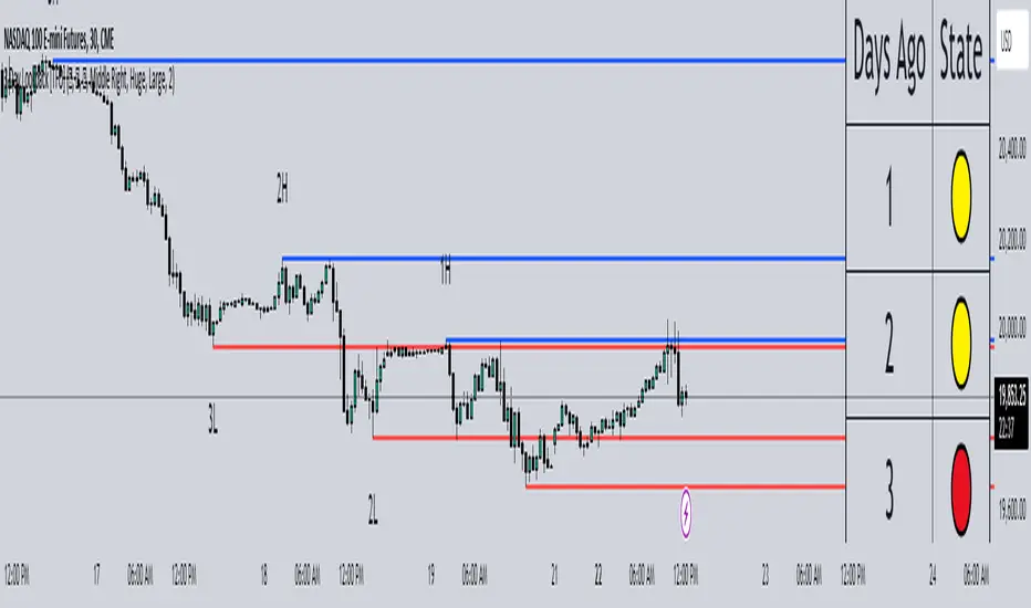 This 3 Day Lookback indicator aims to display key information about price with respect to its previous 3 day highs and lows. It was built with the intention of being compact in order to not take up a lot of chart space.