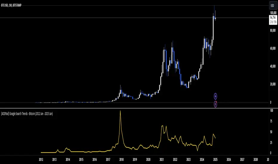 This Pine Script shows the Google Search Trends as an indicator for Bitcoin from January 2012 to January 2025, based on monthly data retrieved from Google Trends. It calculates and displays the relative search interest for Bitcoin over time, offering a historical perspective on its popularity mainly built for