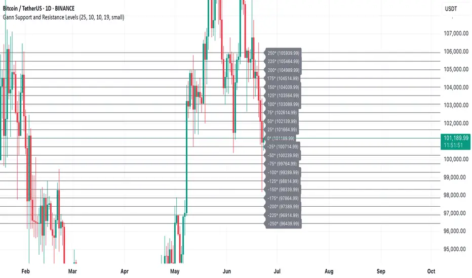 This indicator plots dynamic Gann Degree Levels as potential support and resistance zones around the current market price. You can fully customize the Gann degree step (e.g., 45°, 30°, 90°), the number of levels above and below the price, and the price movement per degree to fine-tune the levels to your strategy.