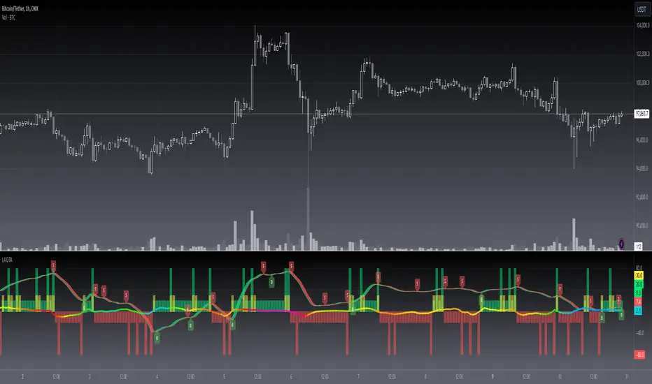 The script implements a dynamic trend analysis indicator named [blackcat] L4 Dynamic Trend Analysis (L4 DTA). It uses a combination of Exponential Moving Averages (EMA), Relative Strength Index (RSI), and custom functions to determine the trend direction and strength. The primary function is to visually represent the trend conditions and potential entry points on the chart.