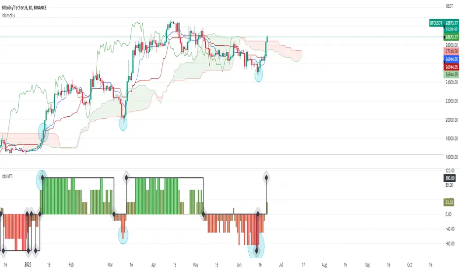 If you like Ichimoku cloud and use it in your analysis, or you are new to it and sometimes gets tricky to figure out all the details, this indicator tries to simplify that and visualize the change of trend and momentum relative to the past based on ichimoku.
