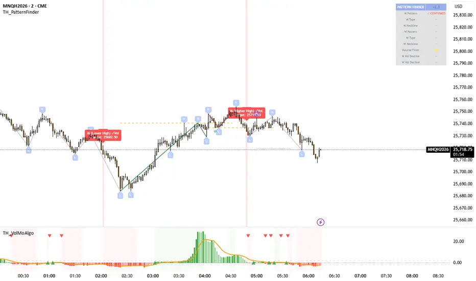 PatternFinder detects M patterns (bearish) and W patterns (bullish) with three variants each.