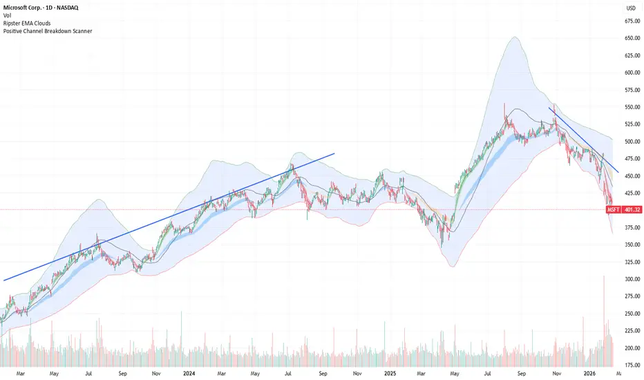 To scan for stocks breaking down from a positive (ascending) channel, the most effective approach in Pine Script is to use Linear Regression. This allows the script to mathematically calculate the "best fit" trendline for a specific lookback period and then identify when the price closes below the lower deviation band.