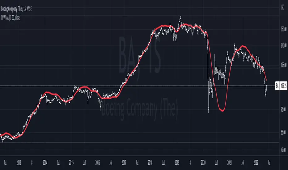 The Pivot-Point Weighted MA is very different from other weighted MAs, in the sense that the price weights can achieve negative values. For an example, if a length of 21 is used, the pivot point will be calculated as 13, meaning that the 13th prior candle will have 0 weight, and all prices before it will have a negative weight on the sum, so their impact is reversed rather than just unweighted.