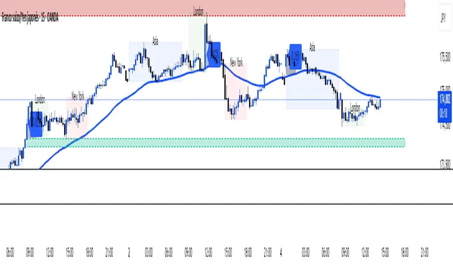 Combine the layers: watch how price behaves within session boxes, around FVG/Order Blocks, and relative to your EMAs to plan entries and exits.