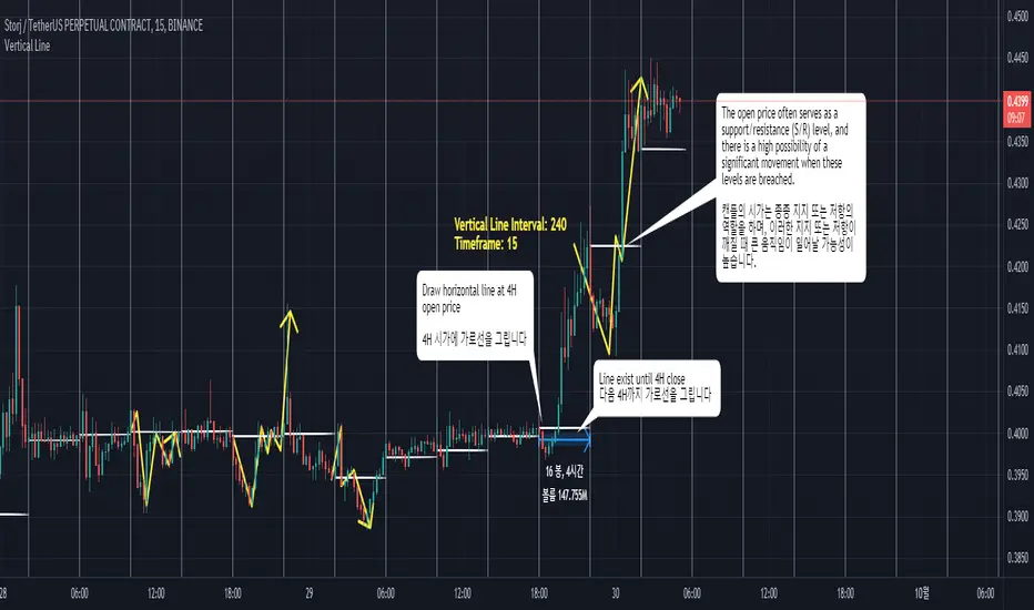 더불어, 이 스크립트는 각 수직선에서의 캔들의 시가를 나타내는 수평선을 그릴 수 있는 기능도 포함하고 있습니다. 이는 트레이더가 특정 시간 주변의 가격 행동을 관찰하고 정기적인 간격으로 시장 상황을 평가하는데 중요합니다.