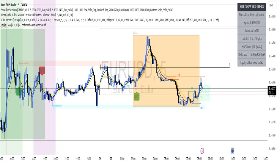 This indicator uses three Exponential Moving Averages (EMA 5, 8, and 13) to generate buy and sell signals when the EMAs are properly aligned and not touching. Signals are confirmed on candle close and can trigger customizable sound alerts directly from the TradingView alert panel.
