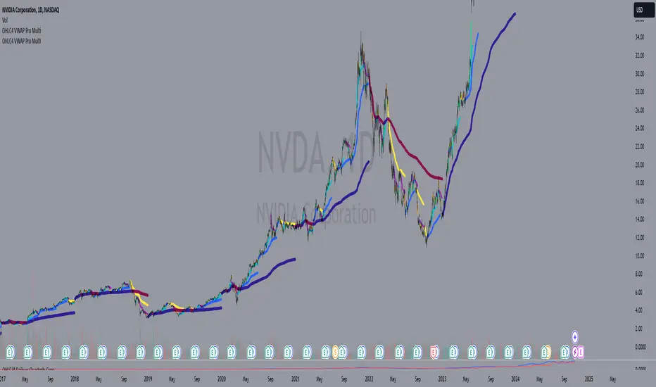 This script combines multiple VWAP calculations into a single overlay, enabling traders to identify support and resistance zones, detect trend shifts, and perform in-depth market analysis effortlessly. By using the OHLC/4 average price instead of the traditional close-only approach, the script offers a balanced perspective, reflecting both intraday volatility and long-term price trends.