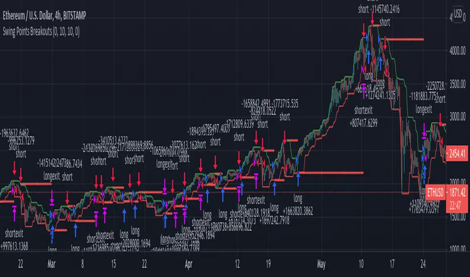 stop order at the Swing High price (green line) and sells with a stop order at the Swing Low price (red line).