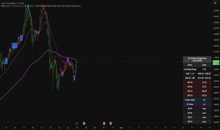 Bridge Boxes: detect compression when N consecutive B-bars occur (|close−open| ≤ ε%). Draw box and store latest top/bottom.