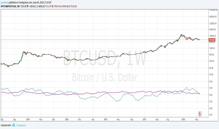 Bollinger Band width is hard to follow on log charts, but it's an excellent indicator for volatility. When BBand % width crosses down through periods of low crosses down through periods where RSI is low, you may be able to count on a substantial reversal over the intermediate or long-term.