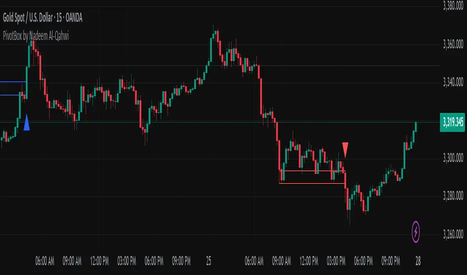 General Idea of the Indicator: The PivotBox indicator is an advanced technical analysis tool designed to identify key reversal points in the market based on pivot highs and pivot lows. The indicator helps traders to detect breakout and breakdown opportunities based on past price movements, guiding informed trading decisions.