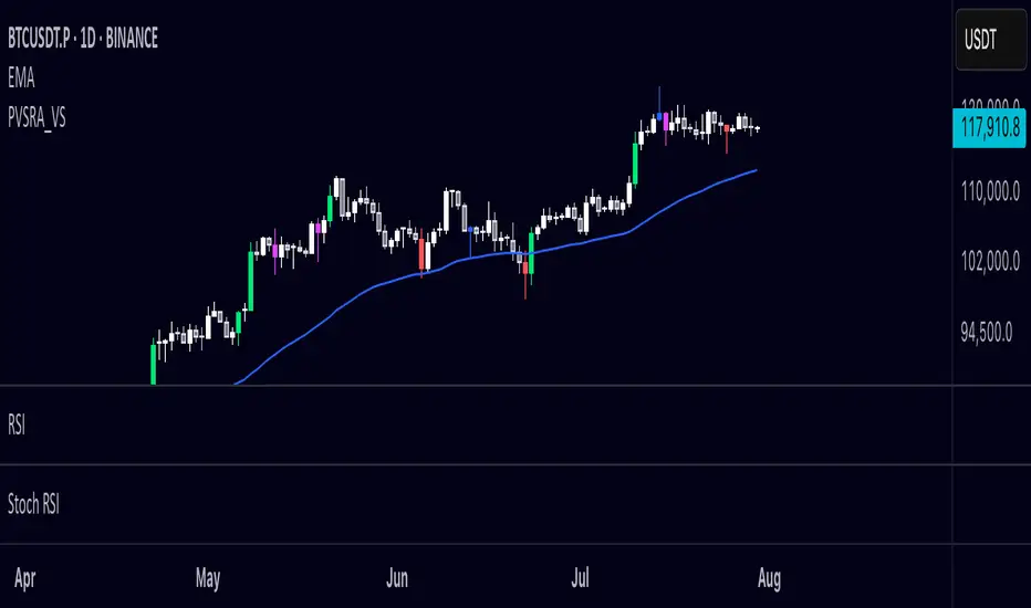 PVSRA Volume Suite v5 is a volume-based candle coloring tool inspired by the original PVSRA system from MT4. It identifies and highlights Climax candles (extremely high volume/spread) and Above-Average volume candles relative to the last 10 bars. Bullish and bearish candles are colored differently based on their volume classification to help spot potential institutional activity or market reversals.