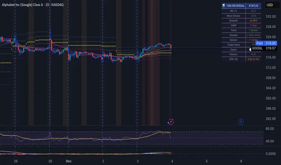 This Short-Term Reversal Strategy optimized for 15-minute US stocks is a comprehensive intraday trading system designed specifically for the fast-paced American equity market operating on a 15-minute timeframe which demands quicker reaction times and tighter risk parameters compared to longer-term strategies the system is built around identifying short-term price extremes and capitalizing on the subsequent reversals that frequently occur during the US trading session from 9:45 to 15:30 Eastern Time deliberately avoiding the volatile first 15 minutes and the unpredictable final 30 minutes of the trading day it employs a sophisticated multi-layered confirmation process that starts by detecting significant price movements over a configurable lookback period typically eight bars representing two hours where a move exceeding a dynamic threshold triggers the initial signal this threshold can adapt to market volatility using the Average True Range ensuring it remains effective in both calm and turbulent conditions each signal is then filtered through several critical layers including a volume filter that checks for above-average trading activity or relative volume compared to the same time in previous days an RSI oscillator set to shorter periods suitable for intraday trading to confirm overbought or oversold conditions a VWAP filter that requires long positions to be below the Volume Weighted Average Price and short positions above it respecting the intraday trend structure and a dual EMA trend filter that can be configured for either counter-trend reversal trading or trend-following strategies the system uniquely integrates Fibonacci retracement levels drawn from recent swing highs and lows which serve as powerful confirmation zones when a reversal signal aligns with these key technical levels resulting in a high-confidence strong signal for execution risk management is rigorously automated with stop-loss orders that can be either percentage-based or derived from current volatility using ATR and take-profit targets calculated to maintain a favorable risk-reward ratio optionally enhanced by trailing stops to protect profits additionally the strategy incorporates practical market wisdom by avoiding the low-activity lunch hour between 12:00 and 13:00 EST and potentially skipping Friday afternoons to reduce weekend risk while also limiting the maximum number of trades per day to prevent overtrading and automatically closing all positions before the market closes to avoid overnight exposure visually the indicator provides a clean interface with plotted Fibonacci levels VWAP and EMA lines while clearly marking entry signals with distinct symbols for regular and strong setups complemented by a comprehensive dashboard in the top corner that displays real-time metrics including RSI price movement volume status trend direction and current trade count making it a self-contained professional-grade tool for disciplined intraday traders seeking to exploit short-term market inefficiencies during US market hours