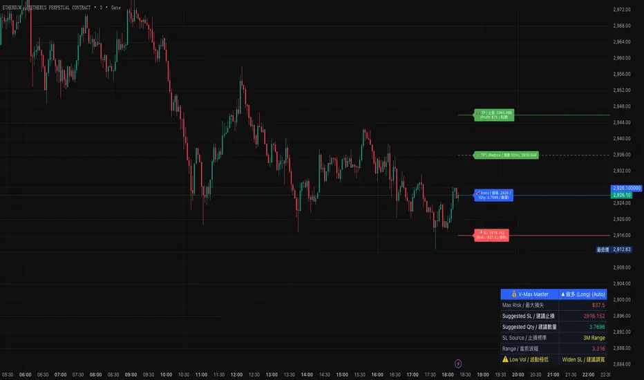 [ ENGLISH SECTION ] Overview V-Max Crypto Position Master is a professional-grade risk management and execution dashboard designed for the TradingView platform. It solves the critical challenge of dynamic position sizing and multi-stage exit planning in volatile crypto markets.