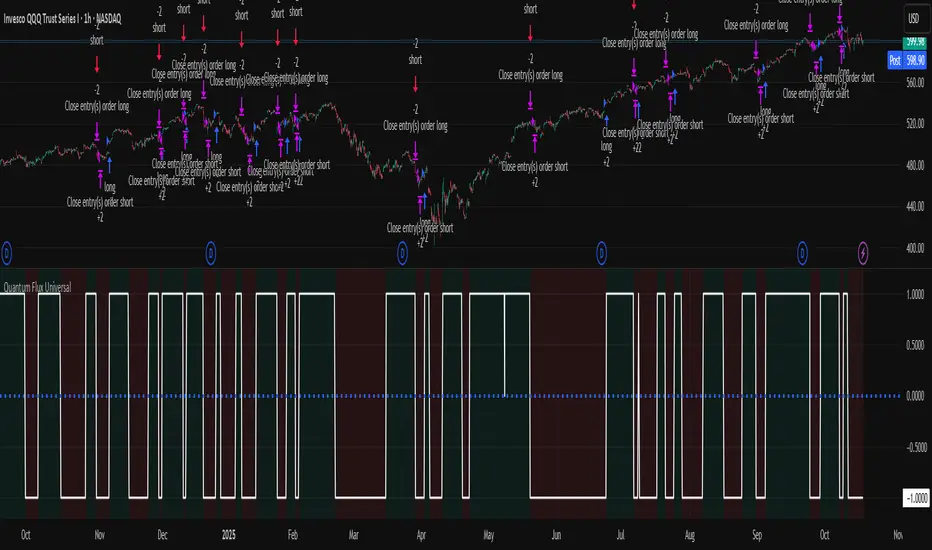 Quantum Flux Universal is a regime switching strategy for stocks, ETFs, index futures, major FX pairs, and liquid crypto on intraday and swing timeframes. It helps you act only when the normalized core signal and its guide agree on direction. It is original because the engine fuses three adaptive drivers into the smoothing gains itself. Directional intensity is measured with binary entropy, path efficiency shapes trend quality, and a volatility squash preserves contrast. Add it to a clean chart, watch the polarity lane and background, and trade from positive or negative alignment. For conservative workflows use on bar close in the alert settings when you add alerts in a later version.