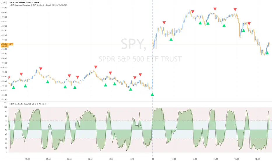 Discover and visualize NEXT Stochastic 3xVW strategies using the companion NEXT Strategy Visualizer indicator. While the %K/%D cross alerts can be set via NEXT Stochastic 3xVW indicator, the Strategy Visualizer will only plot long/short signals when %K or %D cross over or under overbought/oversold levels (as hown in the above SPY M1 screenshot). That being said, the next version of the Strategy Visualizer will also support %K/%D crosses.