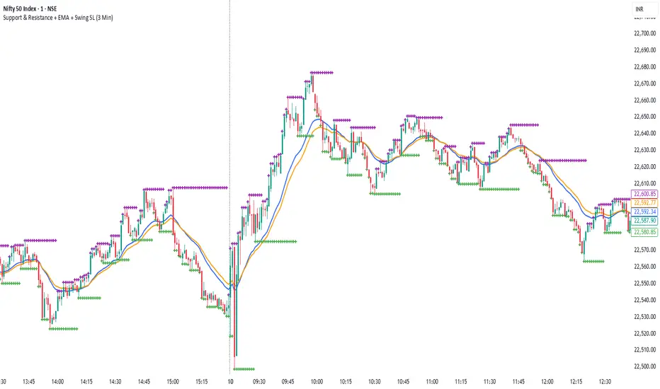 This **Pine Script indicator** for TradingView displays **Support & Resistance levels, EMAs (21 & 26), and Swing High/Low-based Stop-Loss (SL) points** on a **3-minute timeframe**.