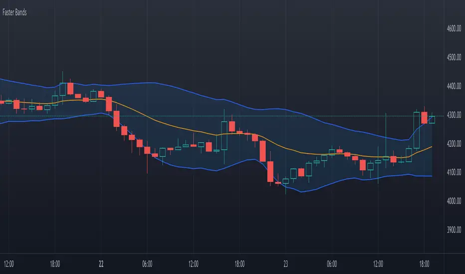 You can use this indicator in the same way as the Bollinger Bands. The advantage of Faster Bands is that it responds faster to price changes and thus can give the signals earlier. You can also get a more stable price channel by changing the Uniformity parameter and using a higher timeframe to calculate the bands.