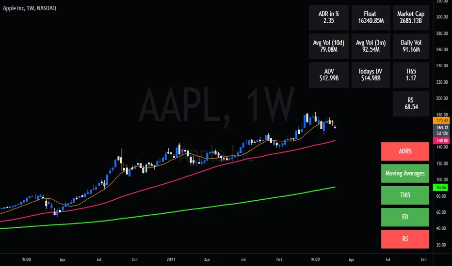 - ADR%, Average Daily Range Percentage. Displayed in the table and used to define a symbol's volatility. A very good tool for Qullamaggie-style trading. Personally, I try to find setups with over 6% ADR. Basic definition; low ADR% = Increased chance of a symbol to move slower and in smaller ranges. A higher value equals the opposite.