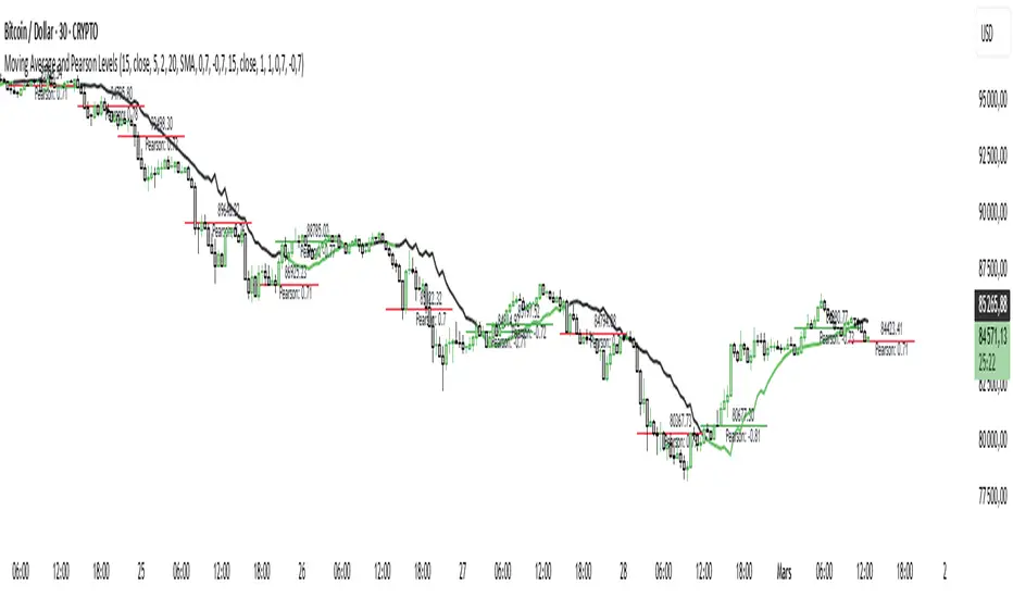 This Pine Script indicator combines a customizable moving average (MA) with Pearson correlation analysis to provide traders with deeper insights into trends and key reference levels. It overlays a Pearson-adjusted moving average on price charts and highlights levels based on correlation for potential trading opportunities. With flexible parameters, it adapts to various trading styles.