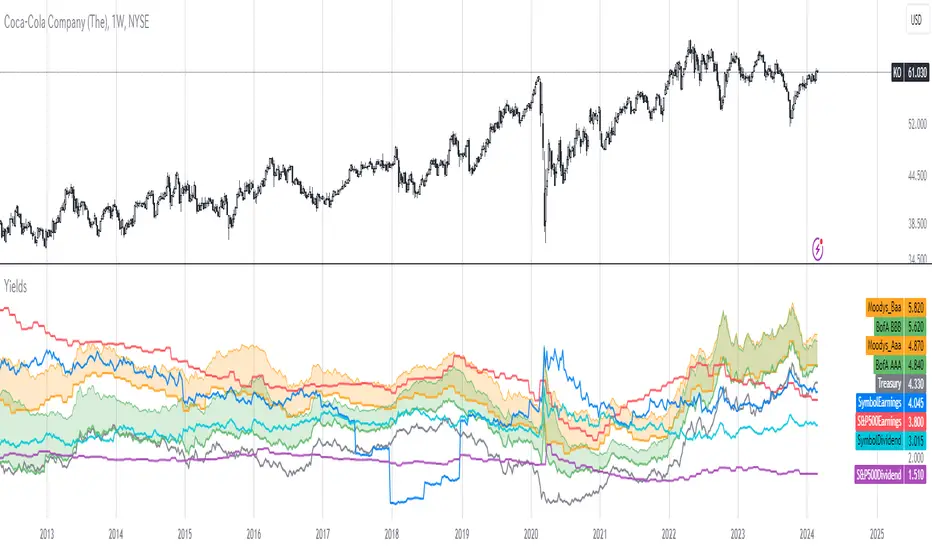 I created this because I wanted to compare the Earnings/Dividend yield of SP500 and the symbol with the time period of the chart.