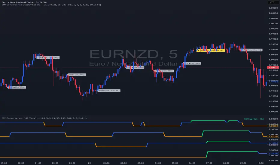 The EW Convergence Suite is a dual-component Elliott-Wave inspired tool designed to help traders spot multi-timeframe convergence points — the places where waves across different timeframes terminate together and trend changes often ignite.