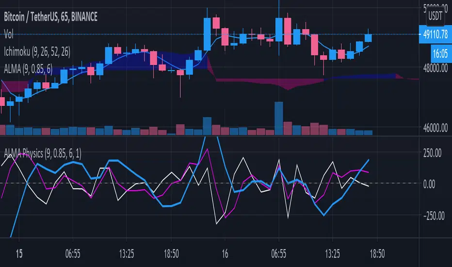A super simple yet elegant indicator, "ALMA Physics" calculates the derivatives of the Arnaud Legoux Moving Average (ALMA) with respect to Time. Both the ALMA parameters and the time variable can be modified in the indicator's settings.