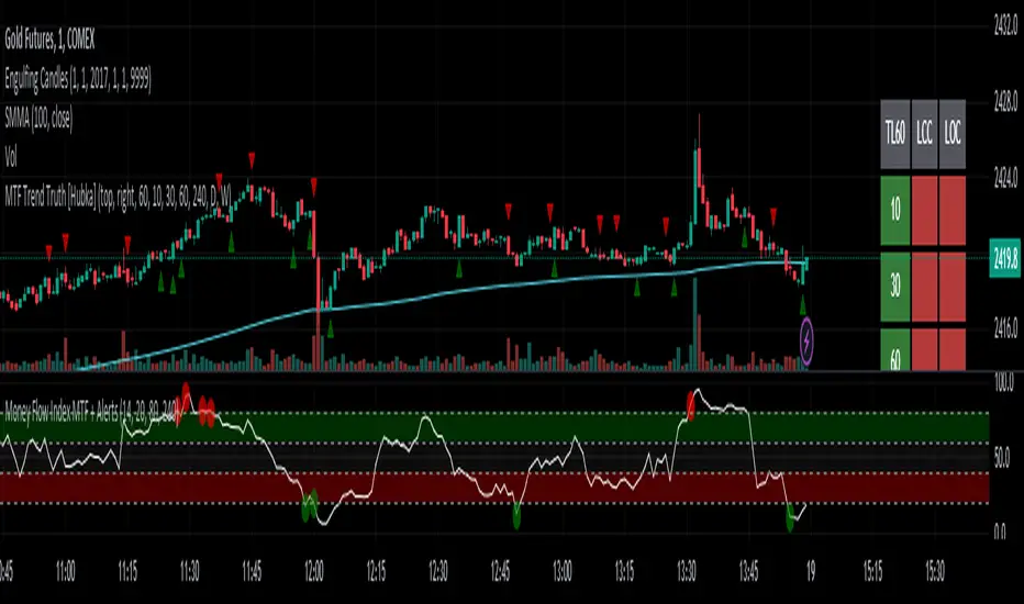 A Multi Time Frame Tend table that displays symbols trends for 6 selectable Time Intervals. In addition to the 6 first row color trends, the table also displays the direction of the last 2 candles in each Time Interval in the last 2 rows. This extra interval information displays price trend direction change or may add confluence if the price direction is the same.